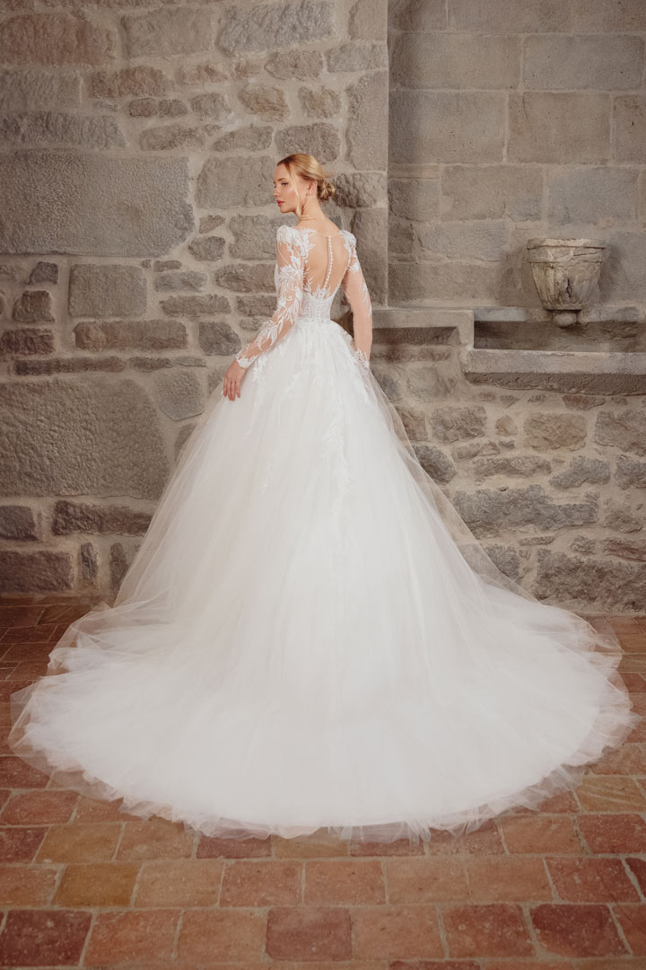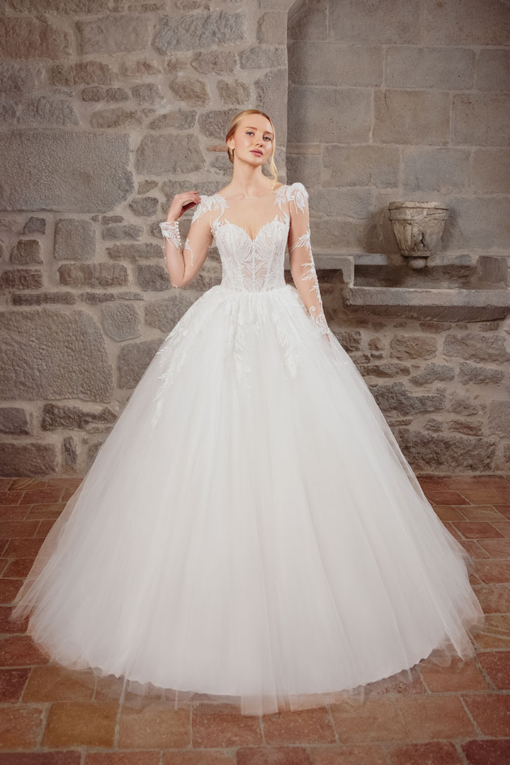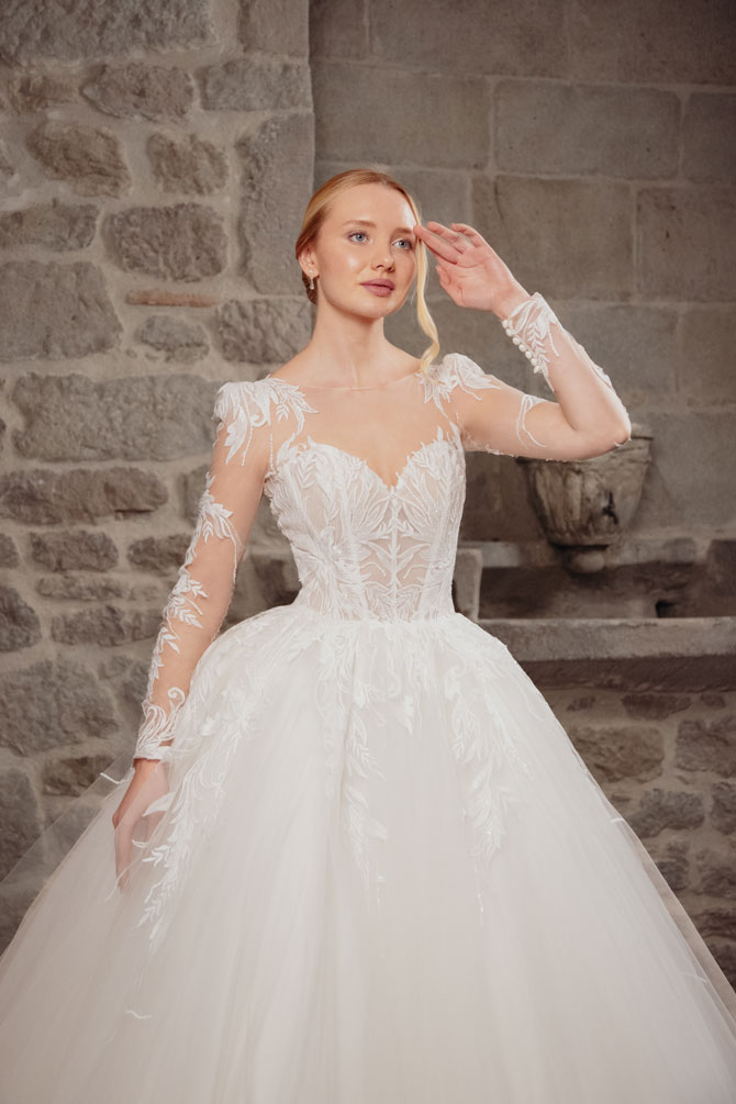 Step into the enchanting world of ‘Affable,’ our princess silhouette wedding gown crafted from delicate lace and airy tulle. This gown exudes a sense of romantic charm that will sweep you off your feet. The sweetheart neckline adds a touch of allure, perfectly complemented by the long illusion sleeves that evoke a sense of timeless elegance. The illusion tulle back adds a whimsical touch, creating an ethereal silhouette. In a soft ivory hue, ‘Affable’ embodies romance and sophistication, making it the perfect choice for a bride seeking a dreamy and enchanting look on her special day.