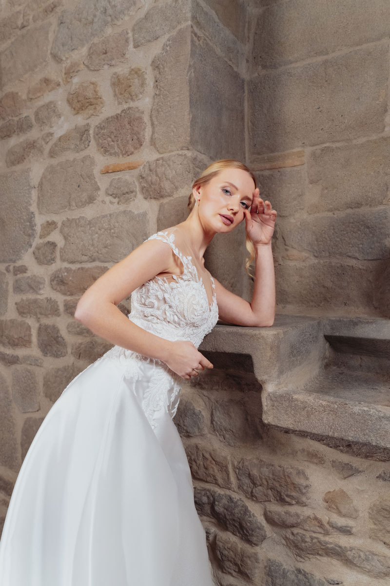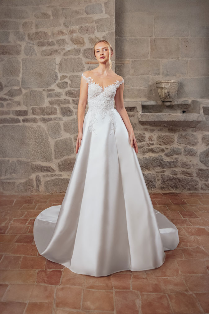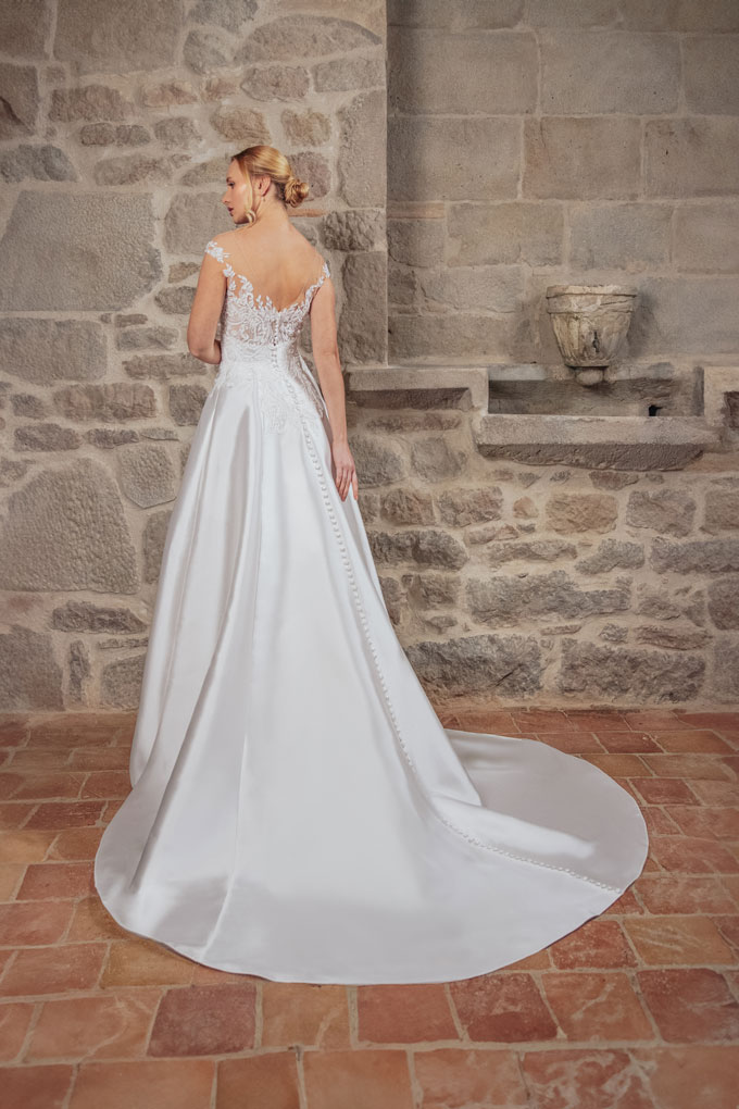 Step into the enchanting world of ‘Affetto,’ where romance meets sophistication in a timeless princess silhouette. Crafted from luxurious mikado and adorned with delicate lace accents, this gown is a true masterpiece of elegance. The sweetheart neckline frames the bride’s natural beauty with grace and charm, while the slender straps add a touch of refinement. The open back design adds a hint of allure, ensuring a captivating entrance from every angle. In a soft ivory hue, ‘Affetto’ embodies the essence of romance, making it the perfect choice for a bride seeking a dreamy and romantic look on her special day.
