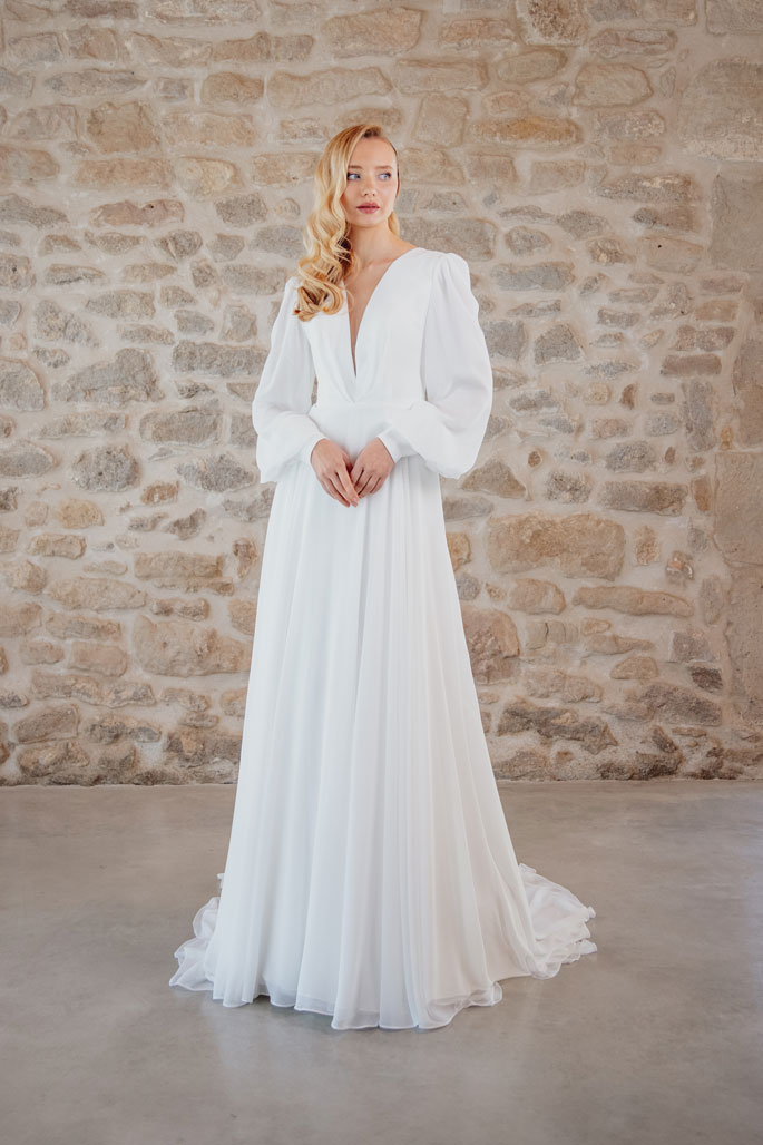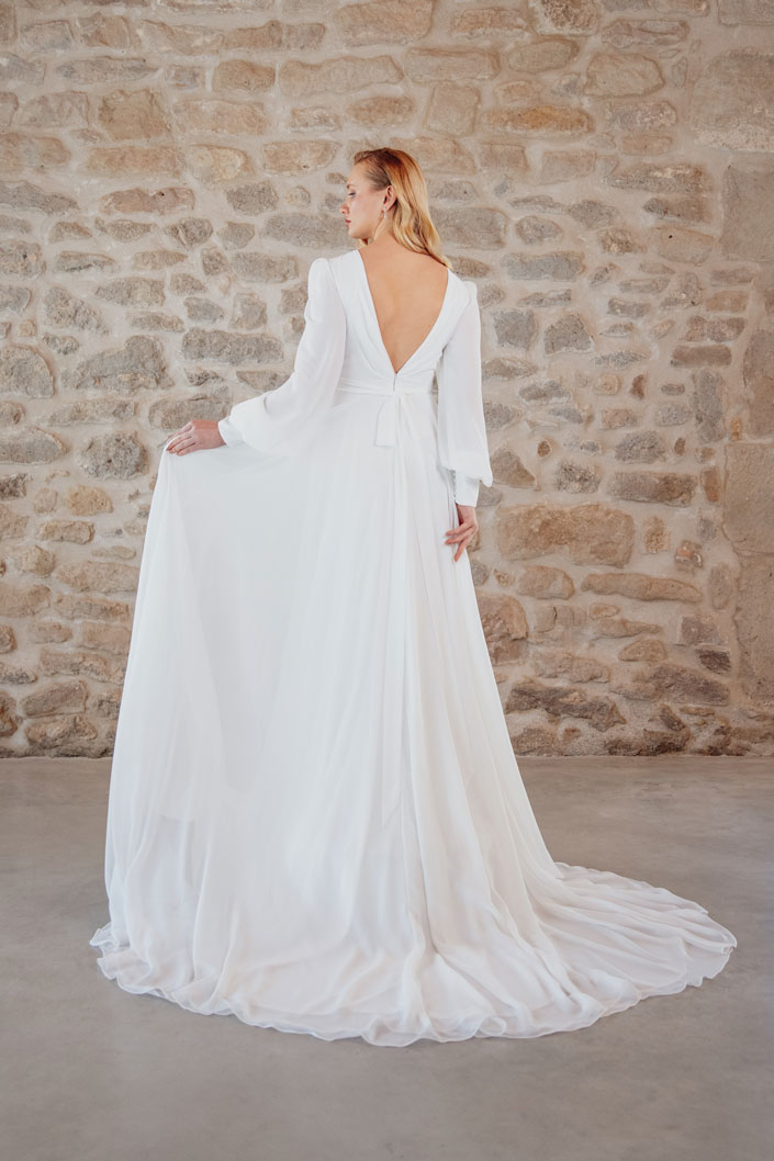 Introducing ‘Alight,’ a bohemian-inspired dream designed to enchant and captivate. Crafted from ethereal chiffon in a soft ivory hue, this A-cut gown exudes effortless elegance. The V-neckline adds a touch of allure, framing the bride’s natural beauty with grace. Adorned with long puffed sleeves, ‘Alight’ channels boho chic with a whimsical twist. The V-back design adds a hint of romance, ensuring an enchanting look from every angle. Perfect for the free-spirited bride seeking a unique and romantic style on her special day.