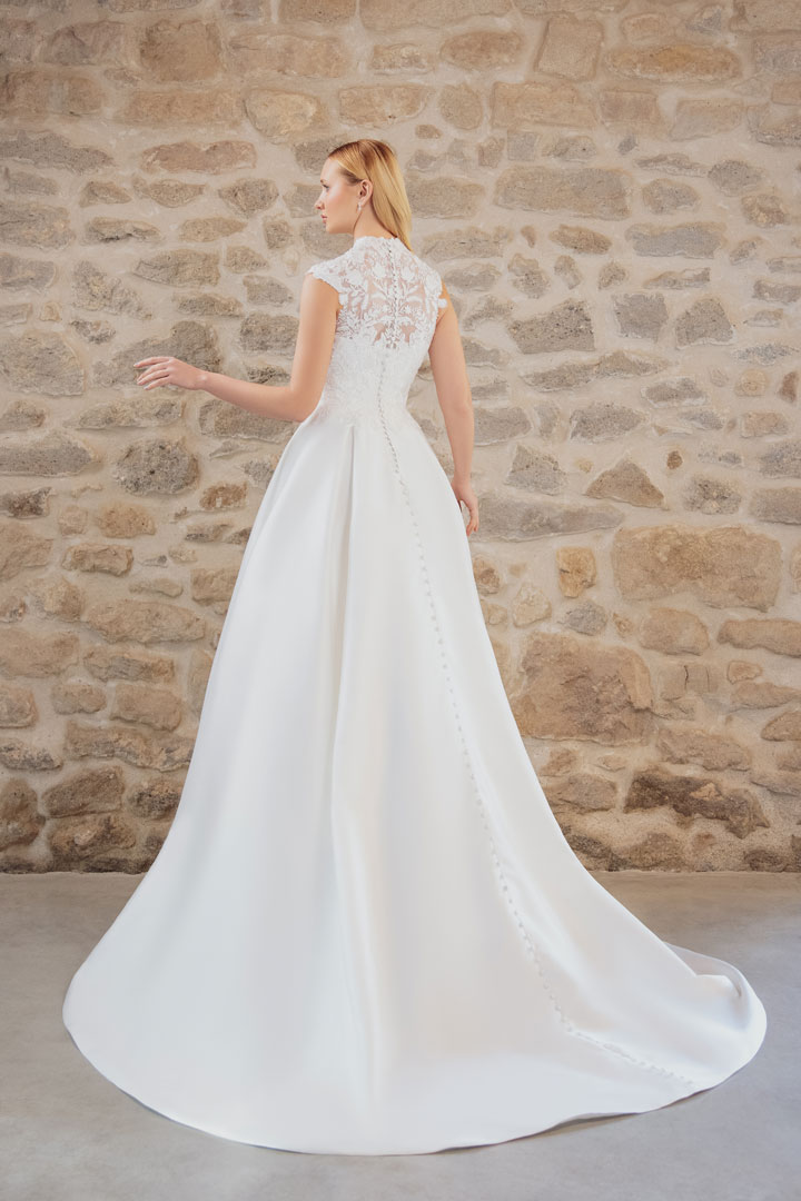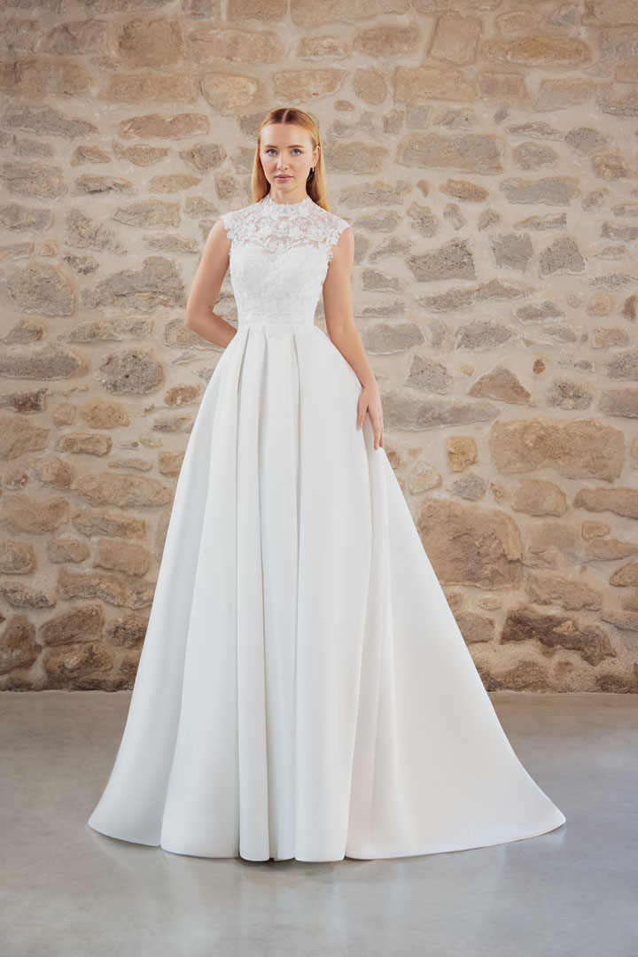Introducing ‘Amazed,’ a princess silhouette gown that captures the essence of timeless romance. Crafted with luxurious mikado and delicate lace in a soft ivory hue, this gown exudes sophistication and grace. The halter neckline adds a touch of modern elegance, framing the bride’s neckline with subtle allure. With a closed back, ‘Amazed’ offers a sense of traditional charm while maintaining its romantic appeal. Perfect for the bride seeking a classic yet enchanting look on her special day.