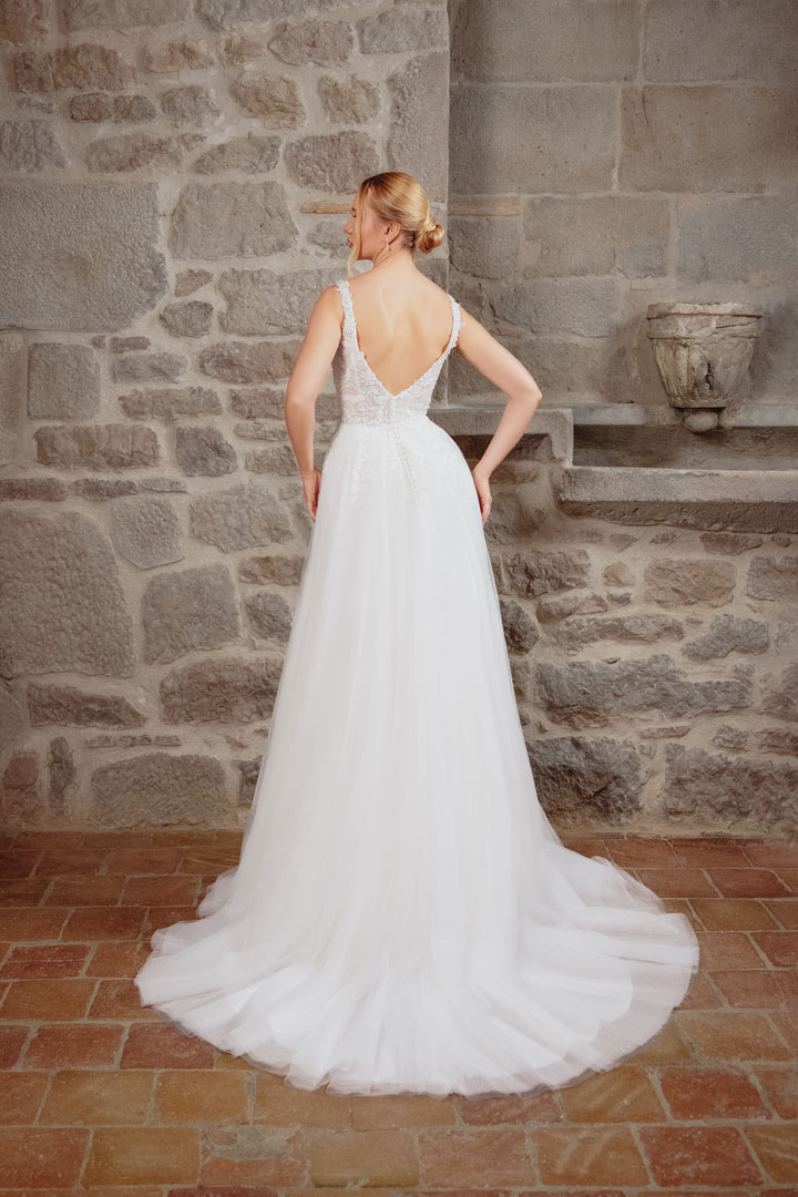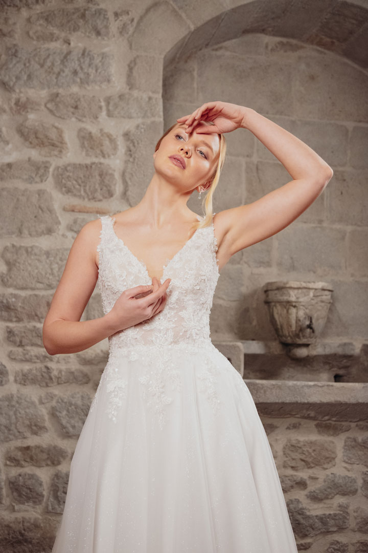 Introducing ‘Aurea,’ a gown that embodies the essence of timeless romance and ethereal beauty. Crafted with delicate tulle and adorned with intricate lace details, this princess silhouette gown exudes grace and sophistication in ivory. The V-neckline frames the bride’s natural beauty with elegance and allure, while delicate straps add a touch of whimsical charm. With an open back design that whispers of modern romance, ‘Aurea’ invites you to dance under the stars and embrace the magic of your special day. Perfect for the bride seeking a captivating and romantic look that will leave a lasting impression.